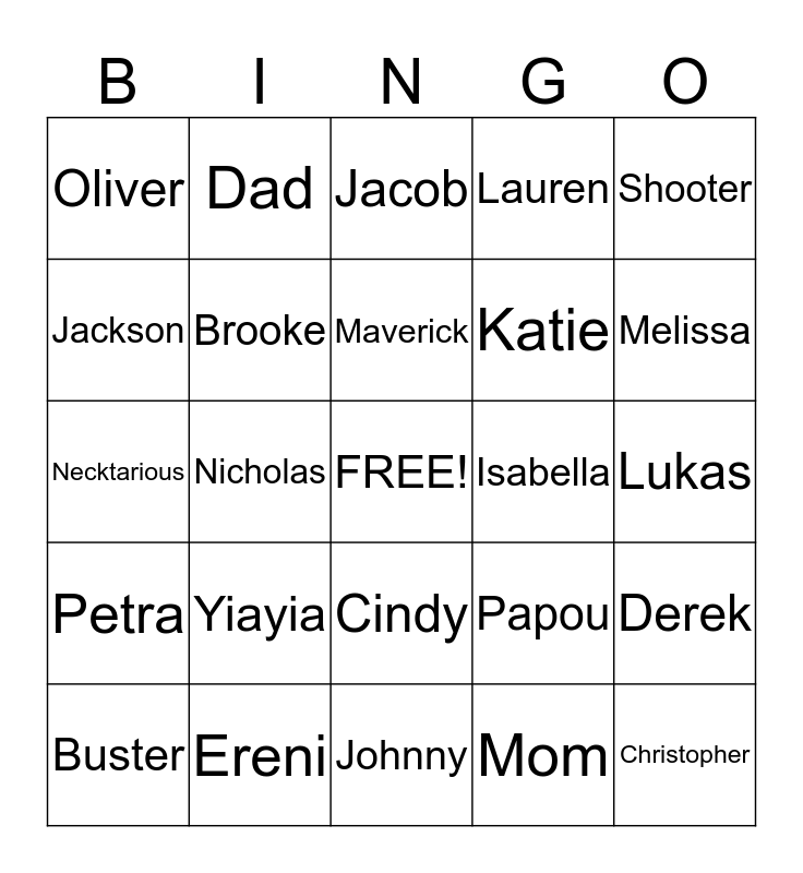 This bingo card has a free space and 24 words: Yiayia, Ereni, Maverick, Buster, Shooter, Oliver, Jackson, Dad, Isabella, Cindy, Katie, Necktarious, Papou, Derek, Brooke, Mom, Lukas, Jacob, Melissa, Nicholas, Christopher, Petra, Lauren and Johnny.