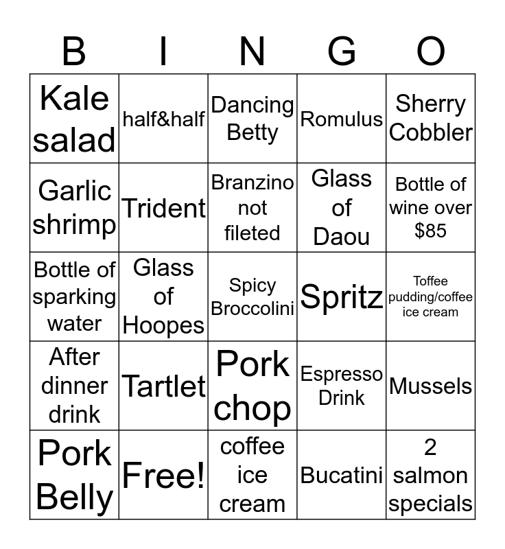 This bingo card has 30 words: Free!, Bottle of Veuve, Glass of Hoopes, Octopus, Kale salad, Dancing Betty, Trident, Pork chop, Spritz, coffee ice cream, Toffee pudding/coffee ice cream, Spicy Broccolini, Bucatini, 2 salmon specials, Bottle of wine over $85, folding napkin, Espresso Drink, After dinner drink, Tartlet, Sherry Cobbler, Bottle of sparking water, gnocchi, half&half, Glass of Daou, Garlic shrimp, Romulus, Mussels, Pork Belly, Branzino not fileted and Glass Veuve.