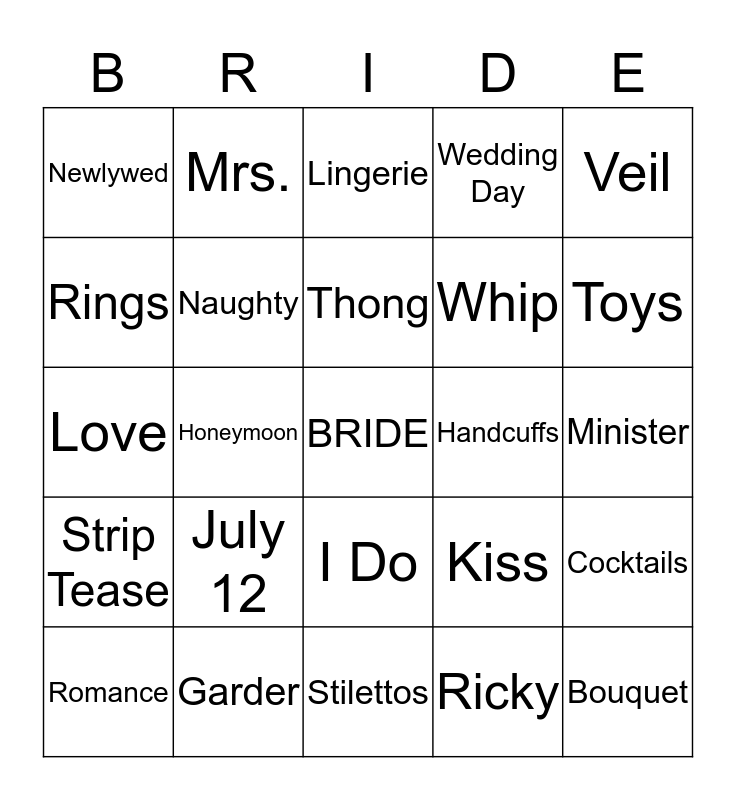 This bingo card has a free space and 24 words: July 12, Garder, Thong, Romance, Veil, Newlywed, Rings, Mrs., Handcuffs, I Do, Whip, Love, Kiss, Cocktails, Naughty, Ricky, Minister, Lingerie, Toys, Honeymoon, Bouquet, Strip Tease, Wedding Day and Stilettos.