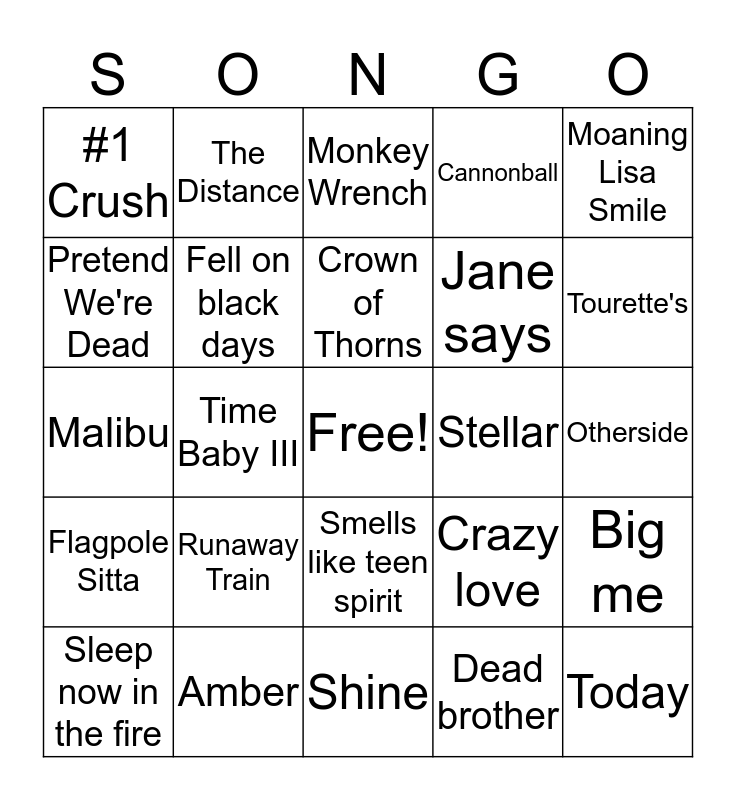 This bingo card has a free space and 35 words: Burden in my hand, Rusty Cage, Come as you are, Fell on black days, Smells like teen spirit, Cannonball, Pretend We're Dead, Nearly Lost You, Crown of Thorns, Losing Skin, Malibu, Moaning Lisa Smile, 1979, Killing in the name, #1 Crush, Stellar, Dead brother, Time Baby III, Flagpole Sitta, Today, Crazy love, Sleep now in the fire, Big me, Amber, Monkey Wrench, Tourette's, Where is my mind?, Wish you were here, Jane says, Otherside, Creep, Shine, Runaway Train, The Distance and Stupid Girl.