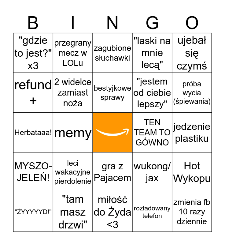 This bingo card has a free space and 24 words: leci wakacyjne pierdolenie, "tam masz drzwi", bestyjkowe sprawy, "ŻYYYYYD!", ujebał się czymś, "gdzie to jest?" x3, refund +, przegrany mecz w LOLu, TEN TEAM TO GÓWNO, gra z Pajacem, "jestem od ciebie lepszy", Herbataaa!, wukong/ jax, Hot Wykopu, 2 widelce zamiast noża, rozładowany telefon, jedzenie plastiku, zagubione słuchawki, próba wycia (śpiewania), memy, zmienia fb 10 razy dziennie, MYSZO-JELEŃ!, "laski na mnie lecą" and miłość do Żyda <3.