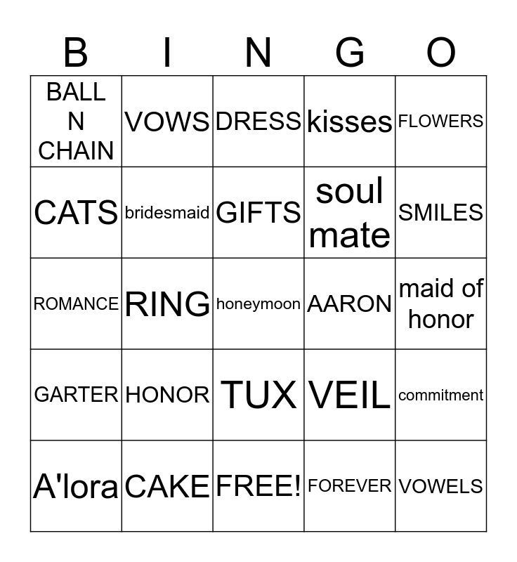This bingo card has 29 words: A'lora, LOVE, RING, VOWELS, BALL N CHAIN, DRESS, bridesmaid, HONOR, AARON, CAKE, maid of honor, honeymoon, FREE!, FOREVER, SMILES, WHITE, TUX, GARTER, FLOWERS, ROMANCE, VEIL, I DO, soul mate, CATS, kisses, VOWS, commitment, GIFTS and MONEY.