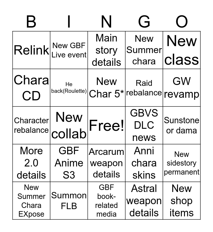 This bingo card has a free space and 24 words: GBF Anime S3, Summon FLB, New Char 5*, New Summer Chara EXpose, New class, Relink, Chara CD, New GBF Live event, GBVS DLC news, Arcarum weapon details, Raid rebalance, Character rebalance, Anni chara skins, New sidestory permanent, He back(Roulette), Astral weapon details, Sunstone or dama, Main story details, GW revamp, New collab, New shop items, More 2.0 details, New Summer chara and GBF book-related media.
