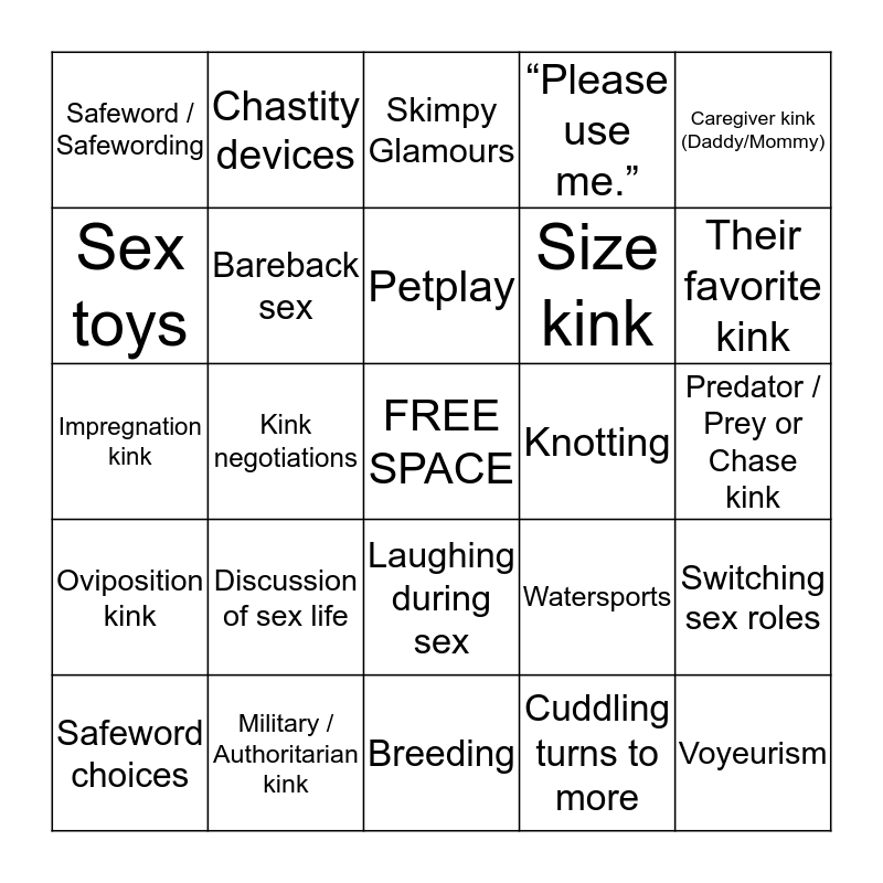 This bingo card has a free space and 66 words: Alpha / Omega, going into heat, Roleplay, Double penetration, Switching sex roles, Skype / Phone sex, Body Worship, Chastity devices, Your favorite kink, Petplay, Habits, Laughing during sex, Dom / Sub play, Predator / Prey or Chase kink, Caregiver kink (Daddy/Mommy), Edgeplay, Sex toys, Kink negotiations, Safeword / Safewording, Pining / Seduction, Size kink, Discussion of sex life, Oviposition kink, “Please use me.”, Master / servant play, Threesome / Orgy, Gentle sex, “I didn’t realize I was into that.”, Dirty talking, Voyeurism, Public / Semi-Public sex, Safeword choices, Bondage, First time having sex together, Pregnancy, Watersports, Military / Authoritarian kink, Exhibitionism, Impregnation kink, Cuddling turns to more, “I read about this on the internet.”, Bareback sex, Secret sex, Knotting, “There’s only one bed.”, Sensory Deprivation / Sensory play, Sex in a closet, Their favorite kink, Medical play, Possessive, Masturbation, Anonymous / Anonymous Roleplay, Outdoor Sex, Foodplay, Praise, Quickie, One Night Stand, Voice Kink, Disobedience, Skimpy Glamours, Breeding, Clothed Sex, Seduction (status), Biting, Devotion, Mile-High Club and Hair Pulling.