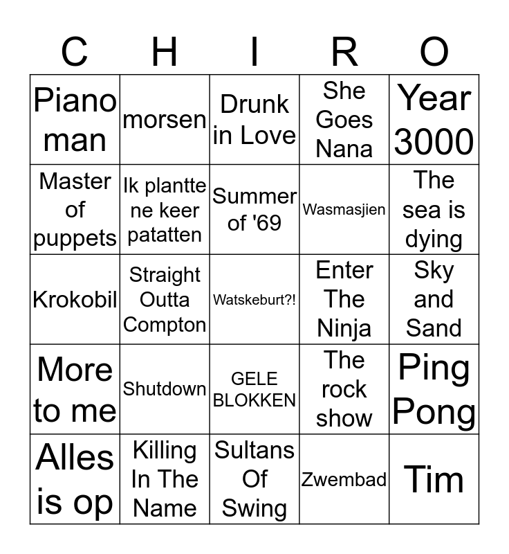 This bingo card has 45 words: Voici les clés, Watskeburt?!, Eins Zwei Polizei, Alles is op, In the shade of the sun, Zwembad, Drunk in Love, Johnny B. Goode, Year 3000, Killing In The Name, She Goes Nana, Enter The Ninja, GELE BLOKKEN, Shutdown, De soep is aangebrand, Sultans Of Swing, One more time, Krokobil, Closing time, The sea is dying, morsen, CoCo, Keuning van de jacht, Piano man, Teenage Dirtbag, Sky and Sand, We built this city, Pakt je zak, The rock show, More to me, Hotel California, Ping Pong, Stacy's Mom, Als ze lacht, De vriendschapsband, Straight Outta Compton, De zotte morgen, Thinking about leaving, Tim, Summer of '69, Master of puppets, Wasmasjien, City Of Angels, Ik plantte ne keer patatten and Prijsdu gelukkig.