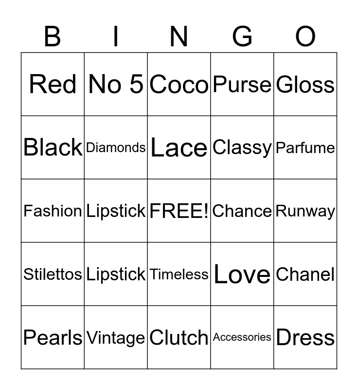 This bingo card has a free space and 24 words: Lipstick, Vintage, Lace, Pearls, Gloss, Red, Black, No 5, Chance, Timeless, Classy, Fashion, Love, Chanel, Diamonds, Accessories, Runway, Coco, Parfume, Lipstick, Dress, Stilettos, Purse and Clutch.