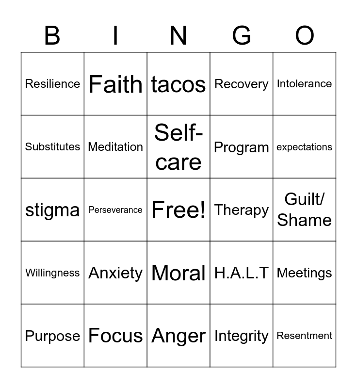 This bingo card has a free space and 49 words: Acceptance, Resentment, Fear, Anger, Anxiety, Depression, Faith, Sponsor, Substitutes, Denial, Meditation, Recovery, Meetings, H.A.L.T, Mindfulness, Courage, Self-care, Therapy, Action, Intolerance, Perseverance, Integrity, Resilience, Program, Powerless, expectations, Purpose, Practice, Moral, Willingness, steps, Distractions, Freedom, Patience, Focus, Affirmations, Enabling, Home Group, Guilt/ Shame, Surrender, Complacency, Altruism, Change, Boundaries, stigma, tacos, plan, H.P. and contentment.