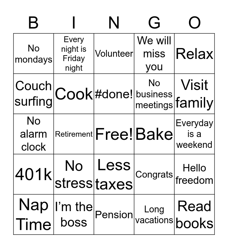 This bingo card has a free space and 29 words: Nap Time, Hobbies, Retirement, Travel, No mondays, Volunteer, Cook, No stress, Bake, I’m the boss, Everyday is a weekend, Read books, Pension, Long vacations, Visit family, Time to annoy my kids, Less taxes, 401k, Relax, No alarm clock, Congrats, It’s always 5pm, No business meetings, Couch surfing, We will miss you, Every night is Friday night, Hello freedom, #done! and Now what?.