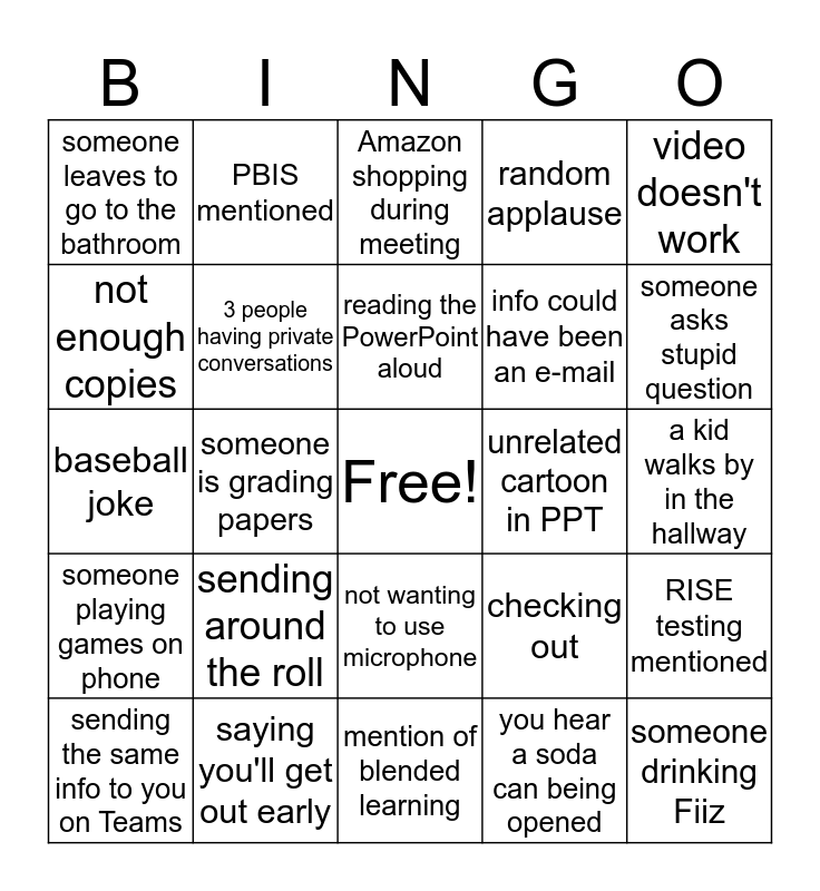 This bingo card has a free space and 24 words: sending around the roll, saying you'll get out early, reading the PowerPoint aloud, sending the same info to you on Teams, video doesn't work, someone leaves to go to the bathroom, not enough copies, PBIS mentioned, unrelated cartoon in PPT, not wanting to use microphone, info could have been an e-mail, baseball joke, checking out, RISE testing mentioned, 3 people having private conversations, you hear a soda can being opened, a kid walks by in the hallway, Amazon shopping during meeting, someone asks stupid question, someone is grading papers, someone drinking Fiiz, someone playing games on phone, random applause and mention of blended learning.