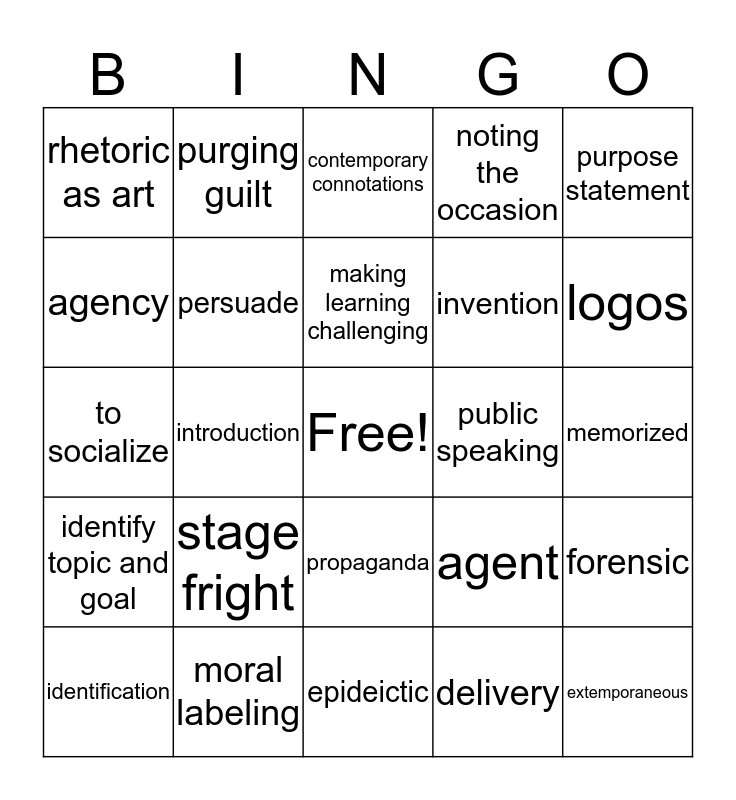 This bingo card has 1 images, a free space and 41 words: Identify speaking goals, to socialize, to inform, persuade, moral labeling, propaganda, making learning challenging, similar, purpose statement, identify topic and goal, introduction, noting the occasion, extemporaneous, memorized, public speaking, stage fright, ethics, rhetoric as art, practical questions, contemporary connotations, forensic, deleberative, epideictic, invention, arrangement, style, delivery, memory, logos, enthymeme, symbolic action, purging guilt, identification, act, agent, agency, scene, purpose, visualize, positive self-talk and preparation.