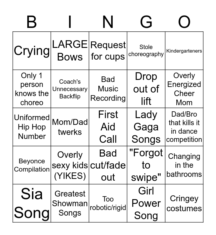 This bingo card has a free space and 34 words: "Oooh get it", Girl Power Song, Old Competitor, Bought Trophy, Beyonce Compilation, Coach's Unnecessary Backflip, Kindergarteners, Sia Song, LARGE Bows, Screaming for Spirit Points, Bad Music Recording, Request for cups, Drill Down, Coffee Spilled by Judges, Lady Gaga Songs, Overly Energized Cheer Mom, Greatest Showman Songs, Uniformed Hip Hop Number, Overly sexy kids (YIKES), "Forgot to swipe", Bad cut/fade out, Audio Pop, Crying, Dad/Bro that kills it in dance competition, Too robotic/rigid, Cringey costumes, Stole choreography, sad ballet :(, Drop out of lift, Only 1 person knows the choreo, Parent leading from the audience, Mom/Dad twerks, Changing in the bathrooms and Practice in midway.