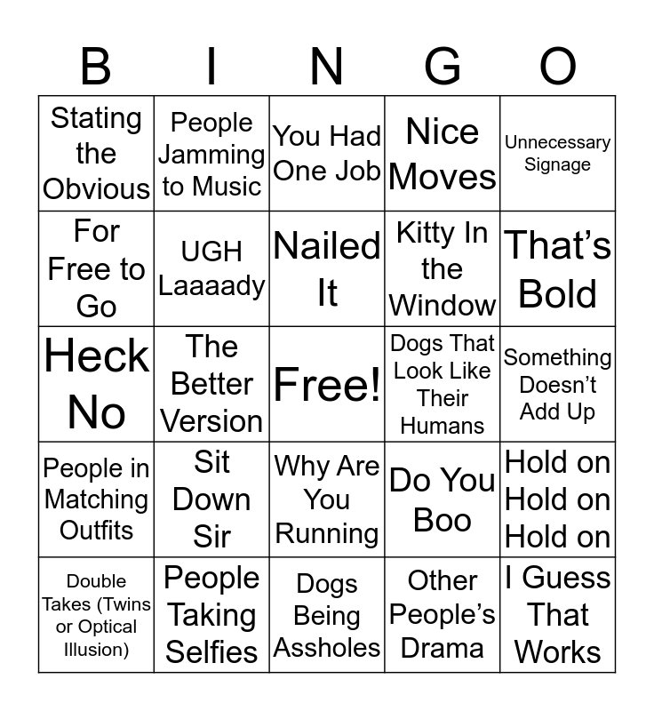 This bingo card has a free space and 25 words: People in Matching Outfits, People Taking Selfies, Dogs Being Assholes, Other People’s Drama, Unnecessary Signage, Stating the Obvious, People Jamming to Music, You Had One Job, Dogs That Look Like Their Humans, Hold on Hold on Hold on, For Free to Go, UGH Laaaady, They Get It, Do You Boo, That’s Bold, Double Takes (Twins or Optical Illusion), The Better Version, Nailed It, Kitty In the Window, Something Doesn’t Add Up, Heck No, Sit Down Sir, Why Are You Running, Nice Moves and I Guess That Works.
