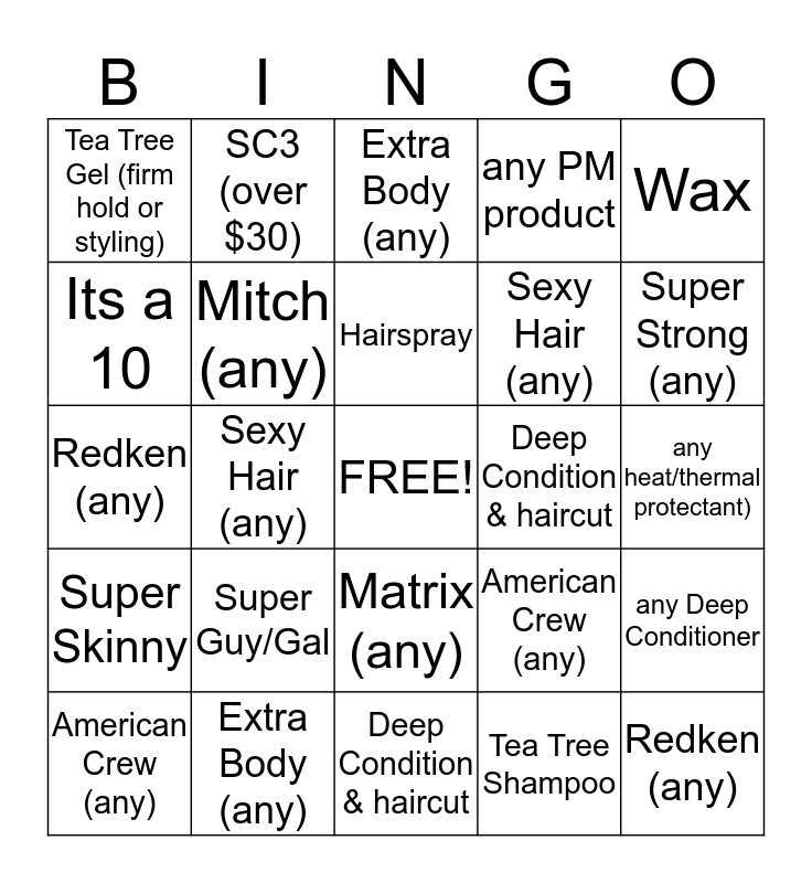 This bingo card has a free space and 24 words: Super Guy/Gal, Extra Body (any), Hairspray, American Crew (any), Wax, Tea Tree Gel (firm hold or styling), Its a 10, SC3 (over $30), Deep Condition & haircut, Matrix (any), Sexy Hair (any), Redken (any), American Crew (any), any Deep Conditioner, Mitch (any), Tea Tree Shampoo, any heat/thermal protectant), Extra Body (any), Super Strong (any), Sexy Hair (any), Redken (any), Super Skinny, any PM product and Deep Condition & haircut.