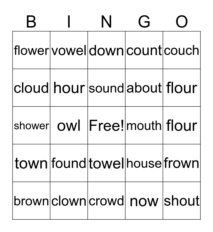 This bingo card has a free space and 24 words: found, clown, sound, brown, couch, flower, cloud, vowel, mouth, towel, about, shower, house, frown, hour, now, flour, down, flour, owl, shout, town, count and crowd.