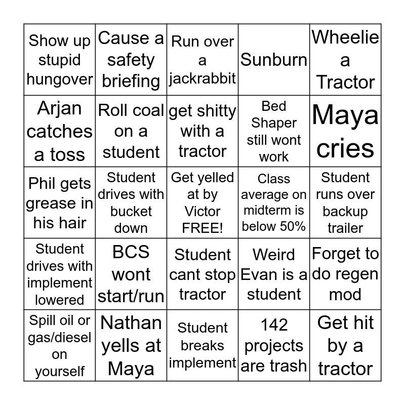 This bingo card has a free space and 24 words: BCS wont start/run, Nathan yells at Maya, get shitty with a tractor, Spill oil or gas/diesel on yourself, Wheelie a Tractor, Show up stupid hungover, Arjan catches a toss, Cause a safety briefing, Class average on midterm is below 50%, Student cant stop tractor, Bed Shaper still wont work, Phil gets grease in his hair, Weird Evan is a student, Forget to do regen mod, Roll coal on a student, 142 projects are trash, Student runs over backup trailer, Run over a jackrabbit, Maya cries, Student drives with bucket down, Get hit by a tractor, Student drives with implement lowered, Sunburn and Student breaks implement.