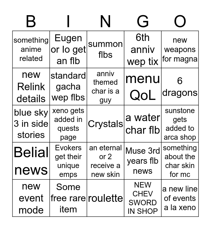 This bingo card has a free space and 24 words: Evokers get their unique emps, Some free rare item, anniv themed char is a guy, new event mode, new weapons for magna, something anime related, new Relink details, Eugen or Io get an flb, a water char flb, an eternal or 2 receive a new skin, menu QoL, blue sky 3 in side stories, Muse 3rd years flb news, something about the char skin for mc, standard gacha wep flbs, NEW CHEV SWORD IN SHOP, sunstone gets added to arca shop, summon flbs, 6 dragons, xeno gets added in quests page, a new line of events a la xeno, Belial news, 6th anniv wep tix and roulette.