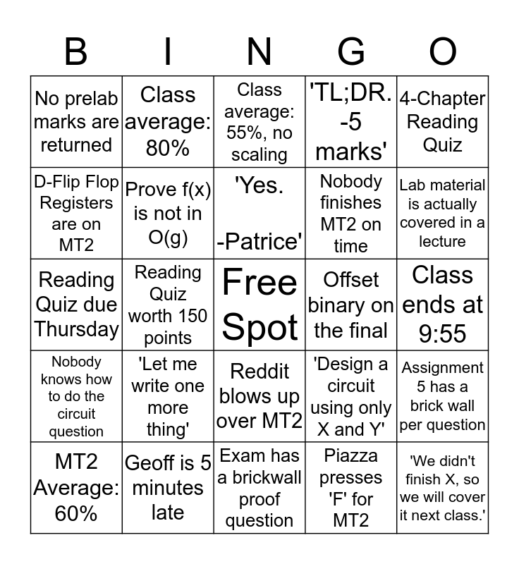 This bingo card has a free space and 24 words: 'Let me write one more thing', Geoff is 5 minutes late, 'Yes. -Patrice', MT2 Average: 60%, 4-Chapter Reading Quiz, No prelab marks are returned, D-Flip Flop Registers are on MT2, Class average: 80%, Offset binary on the final, Reddit blows up over MT2, Nobody finishes MT2 on time, Reading Quiz due Thursday, 'Design a circuit using only X and Y', Assignment 5 has a brick wall per question, Prove f(x) is not in O(g), Piazza presses 'F' for MT2, Class ends at 9:55, Class average: 55%, no scaling, Lab material is actually covered in a lecture, Reading Quiz worth 150 points, 'We didn't finish X, so we will cover it next class.', Nobody knows how to do the circuit question, 'TL;DR. -5 marks' and Exam has a brickwall proof question.