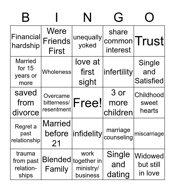 This bingo card has a free space and 24 words: Married before 21, Blended Family, love at first sight, trauma from past relation- ships, Trust, Financial hardship, Married for 15 years or more, Were Friends First, 3 or more children, infidelity, infertility, saved from divorce, marriage counseling, miscarriage, Wholeness, Single and dating, Childhood sweet hearts, unequally yoked, Single and Satisfied, Overcame bitterness/ resentment, Widowed but still in love, Regret a past relationship, share common interest and work together in ministry/ business.