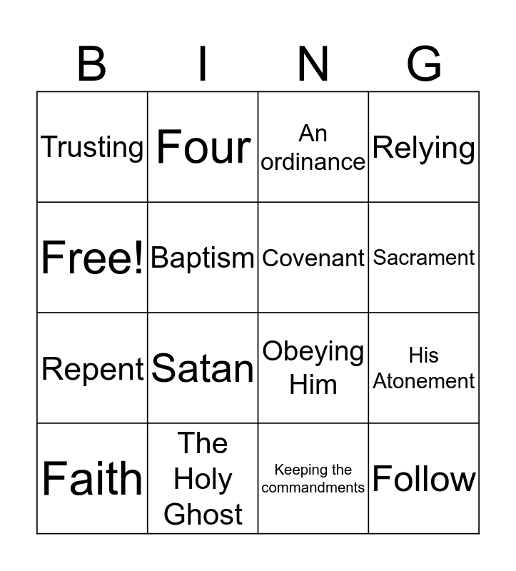 This bingo card has 16 words: The Holy Ghost, His Atonement, An ordinance, Trusting, Repent, Four, Obeying Him, Keeping the commandments, Free!, Baptism, Faith, Relying, Satan, Sacrament, Covenant and Follow.