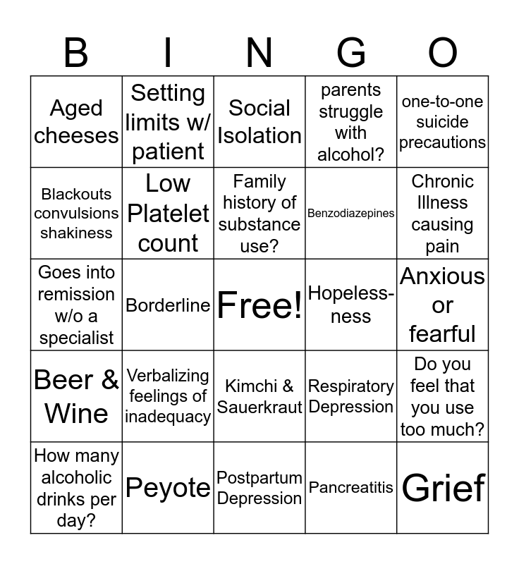 This bingo card has a free space and 30 words: Peyote, Pupil constriction, Borderline, How many alcoholic drinks per day?, Aged cheeses, Social Isolation, Low Platelet count, Kimchi & Sauerkraut, Hopeless-ness, Postpartum Depression, Anxious or fearful, Grief, Pancreatitis, Respiratory, Chronic Illness causing pain, B4, Respiratory Depression, Beer & Wine, Verbalizing feelings of inadequacy, one-to-one suicide precautions, Goes into remission w/o a specialist, Abundance of time and money, Setting limits w/ patient, Benzodiazepines, Blackouts convulsions shakiness, parents struggle with alcohol?, Do you feel that you use too much?, How many alcoholic drinks per day?, Family history of substance use? and Lox & Salami.