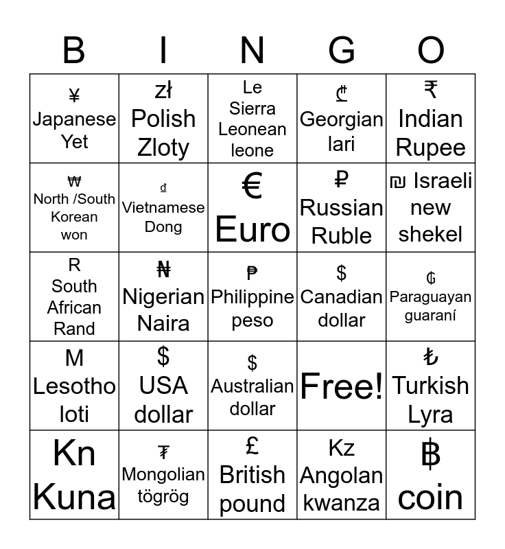 This bingo card has 25 words: $ USA dollar, £ British pound, € Euro, Kn Kuna, ₹ Indian Rupee, ¥ Japanese Yet, ₩ North /South Korean won, zł Polish Zloty, $ Canadian dollar, $ Australian dollar, ₽ Russian Ruble, R South African Rand, Free!, ₺ Turkish Lyra, ₫ Vietnamese Dong, ฿ coin, ₲ Paraguayan guaraní, Le Sierra Leonean leone, ₪ Israeli new shekel, ₦ Nigerian Naira, ₱ Philippine peso, ₮ Mongolian tögrög, M Lesotho loti, ₾ Georgian lari and Kz Angolan kwanza.