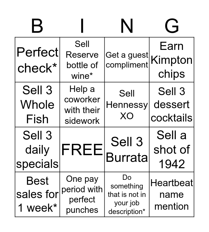 This bingo card has 16 words: One pay period with perfect punches, Sell a shot of 1942, Get a guest compliment, Perfect check*, Sell 3 daily specials, Sell Reserve bottle of wine*, Sell 3 Burrata, Do something that is not in your job description*, Sell 3 Whole Fish, Help a coworker with their sidework, Best sales for 1 week*, Earn Kimpton chips, FREE, Sell 3 dessert cocktails, Sell Hennessy XO and Heartbeat name mention.