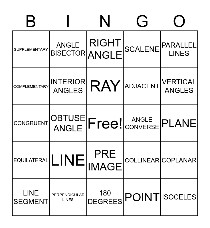 This bingo card has a free space and 24 words: LINE, PERPENDICULAR LINES, RAY, LINE SEGMENT, PARALLEL LINES, SUPPLEMENTARY, COMPLEMENTARY, ANGLE BISECTOR, ANGLE CONVERSE, PRE IMAGE, ADJACENT, CONGRUENT, COLLINEAR, COPLANAR, INTERIOR ANGLES, POINT, PLANE, RIGHT ANGLE, VERTICAL ANGLES, OBTUSE ANGLE, ISOCELES, EQUILATERAL, SCALENE and 180 DEGREES.