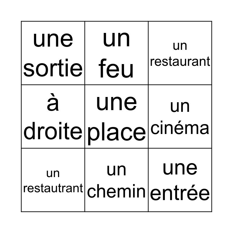 This bingo card has a free space and 8 words: un cinéma, un restaurant, un feu, un restautrant, une sortie, une entrée, à droite and un chemin.