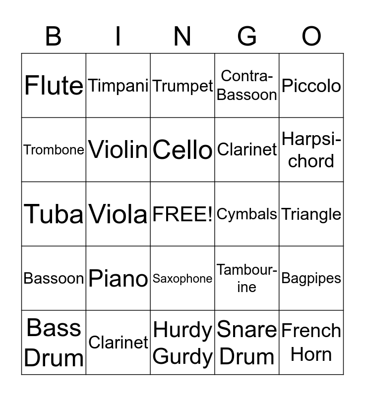 This bingo card has a free space and 24 words: Piano, Clarinet, Cello, Bass Drum, Piccolo, Flute, Trombone, Timpani, Cymbals, Saxophone, Clarinet, Tuba, Tambour- ine, Bagpipes, Violin, Snare Drum, Triangle, Trumpet, Harpsi- chord, Viola, French Horn, Bassoon, Contra- Bassoon and Hurdy Gurdy.