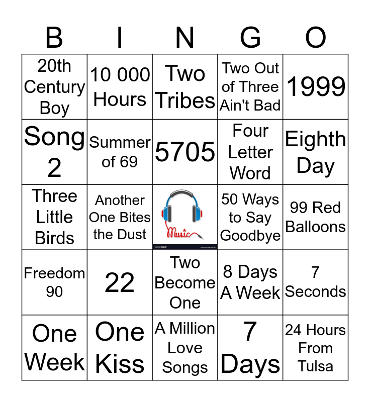 This bingo card has a free space and 24 words: 22, One Kiss, 5705, One Week, 1999, 20th Century Boy, Song 2, 10 000 Hours, 50 Ways to Say Goodbye, Two Become One, Four Letter Word, Three Little Birds, 8 Days A Week, 7 Seconds, Summer of 69, 7 Days, 99 Red Balloons, Two Tribes, Eighth Day, Another One Bites the Dust, 24 Hours From Tulsa, Freedom 90, Two Out of Three Ain't Bad and A Million Love Songs.