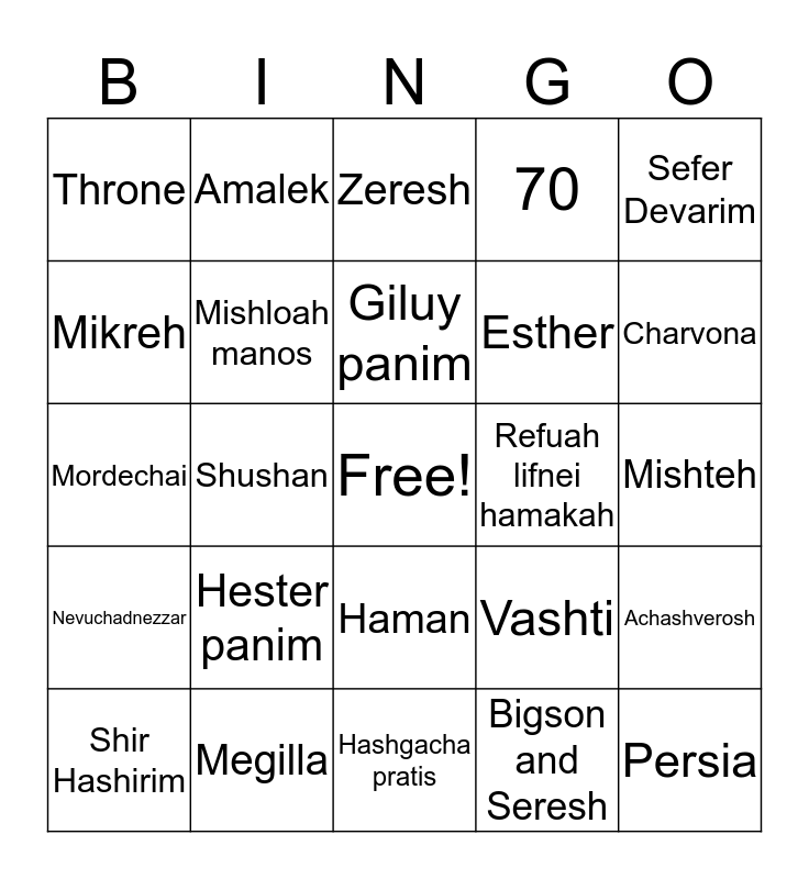 This bingo card has a free space and 25 words: Hester panim, Hashgacha pratis, Giluy panim, Shir Hashirim, Sefer Devarim, Throne, Mikreh, Amalek, Refuah lifnei hamakah, Haman, Esther, Mordechai, Vashti, Achashverosh, Mishloah manos, Matanos l'evyonim, Mishteh, Zeresh, Charvona, Shushan, Persia, Megilla, Nevuchadnezzar, 70 and Bigson and Seresh.