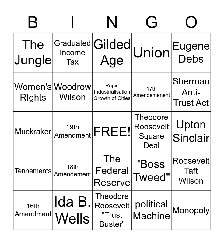 This bingo card has a free space and 25 words: 18th Amendement, Theodore Roosevelt "Trust Buster", Rapid Industrialisation Growth of Cities, 16th Amendment, Eugene Debs, The Jungle, Women's RIghts, Graduated Income Tax, Theodore Roosevelt Square Deal, The Federal Reserve, 17th Amendemenent, Muckraker, 'Boss Tweed", Roosevelt Taft Wilson, Woodrow Wilson, 18th Amendment, Upton Sinclair, Gilded Age, Sherman Anti- Trust Act, 19th Amendment, Monopoly, Ida B. Wells, Tennements, Union and political Machine.
