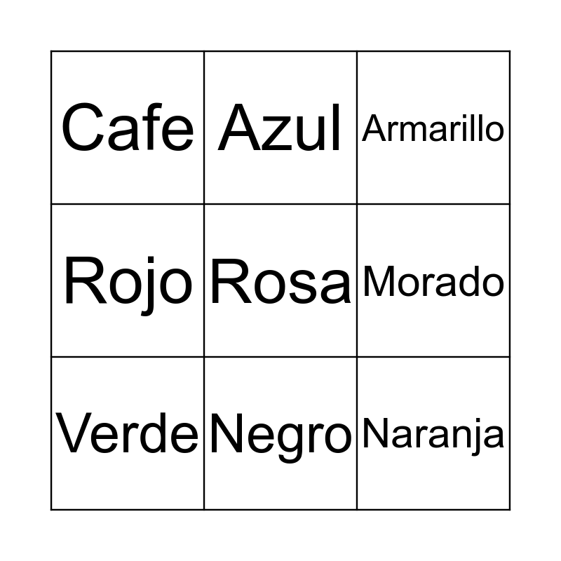 This bingo card has 9 words: Verde, Armarillo, Azul, Rojo, Cafe, Morado, Rosa, Naranja and Negro.