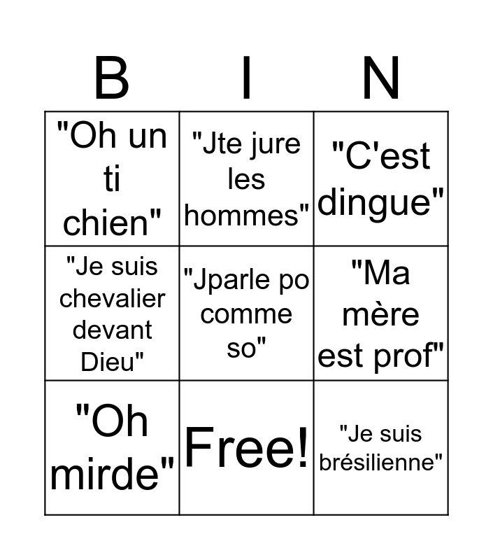 This bingo card has a free space and 9 words: "Oh mirde", "C'est dingue", "Jte jure les hommes", "Je suis chevalier devant Dieu", "Oh un ti chien", "Ma mère est prof", "Je suis brésilienne", "styleux" and Free!.