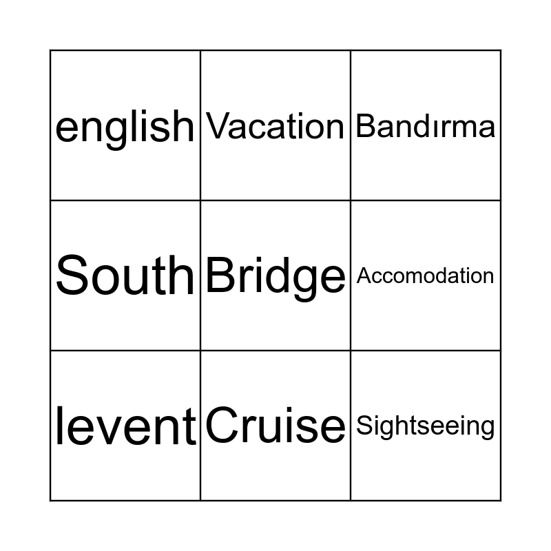 This bingo card has 30 words: antalya, green leaves, 1453, student's hostel, english, Bandırma, levent, Visitor, Location, Destination, Highland, Folk dance, Bullfighting, Climate, Autumn, East, Beach, North, Spectators, Bridge, Population, Ancient, Vacation, Sightseeing, Accomodation, South, Conquer, Spring, Cruise and dormitory.