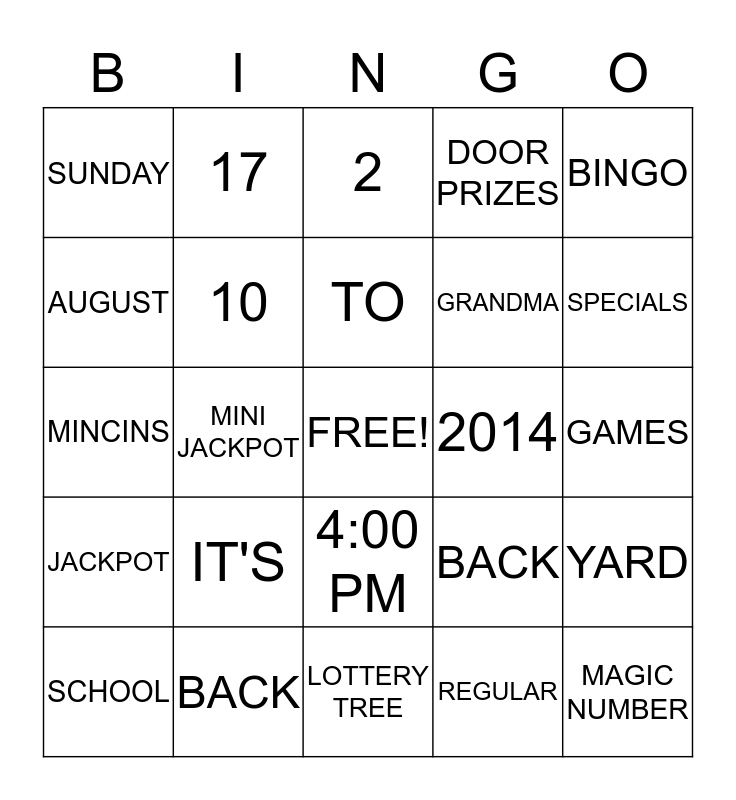 This bingo card has a free space and 24 words: IT'S, BACK, TO, SCHOOL, BINGO, SUNDAY, AUGUST, 17, 2014, 4:00 PM, GRANDMA, MINCINS, BACK, YARD, 10, REGULAR, GAMES, 2, SPECIALS, MINI JACKPOT, MAGIC NUMBER, JACKPOT, DOOR PRIZES and LOTTERY TREE.