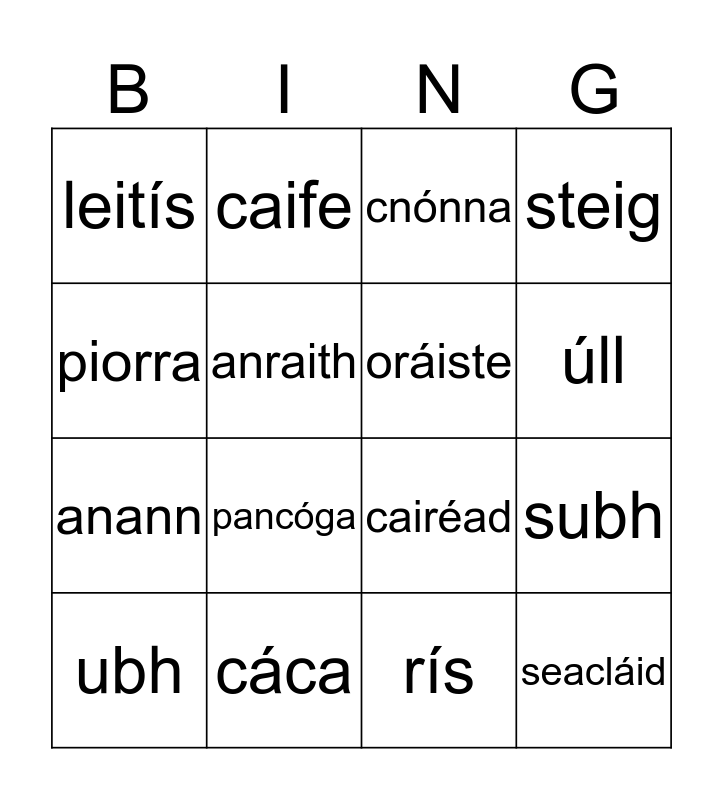 This bingo card has 20 words: subh, sú talún, cnónna, bainne, ubh, piorra, cáca, leitís, anann, caife, pancóga, cairéad, anraith, seacláid, oráiste, iasc, úll, steig, rís and píotsa.