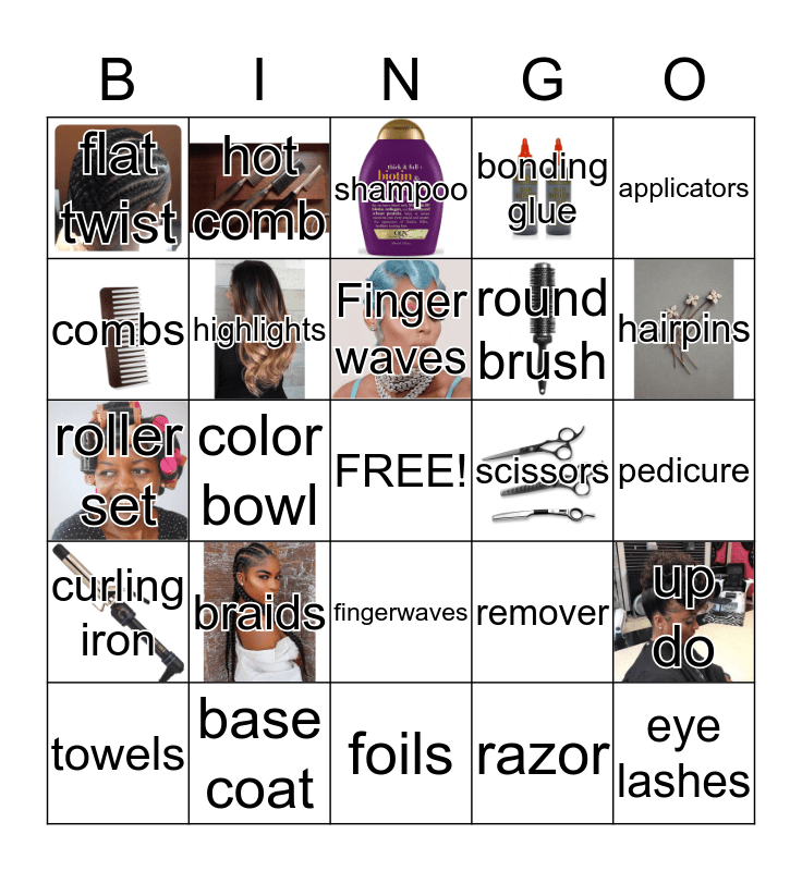 This bingo card has 14 images, a free space and 24 words: braids, base coat, Finger waves, towels, applicators, flat twist, combs, hot comb, scissors, fingerwaves, round brush, roller set, remover, up do, highlights, razor, pedicure, shampoo, hairpins, color bowl, eye lashes, curling iron, bonding glue and foils.