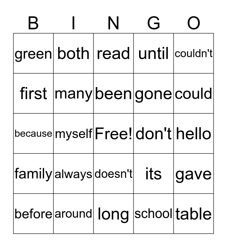This bingo card has a free space and 24 words: always, around, been, before, couldn't, green, first, both, don't, doesn't, gone, because, its, gave, many, school, hello, read, could, myself, table, family, until and long.
