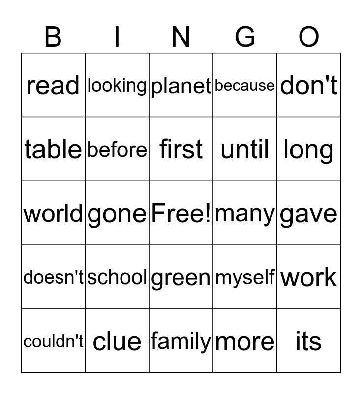 This bingo card has a free space and 39 words: always, around, been, before, couldn't, green, first, both, don't, doesn't, gone, because, its, gave, many, school, hello, read, could, myself, table, family, until, long, garden, showed, afraid, animals, world, looking, have, grown, planet, clue, more, about, work, world and thought.
