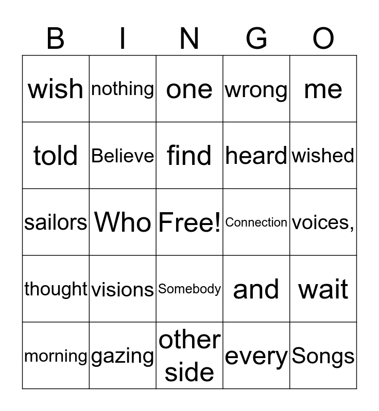 This bingo card has a free space and 49 words: there, Songs, rainbows, other side, visions, illusions, nothing, hide, told, chose, Believe, wrong, wait, and, see, Someday, find, Connection, dreamers, me, Who, every, wish, heard, answered, wished, morning, star, Somebody, thought, look, far, amazing, star, gazing, think, fast, asleep, voices,, calling, name,, sweet, sound, young, sailors, one, same, heard and supposed.