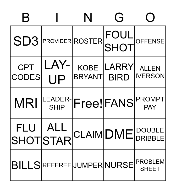 This bingo card has a free space and 24 words: ALL STAR, REFEREE, KOBE BRYANT, BILLS, OFFENSE, SD3, CPT CODES, PROVIDER, FANS, CLAIM, LARRY BIRD, MRI, DME, DOUBLE DRIBBLE, LAY-UP, NURSE, PROMPT PAY, ROSTER, ALLEN IVERSON, LEADER-SHIP, PROBLEM SHEET, FLU SHOT, FOUL SHOT and JUMPER.