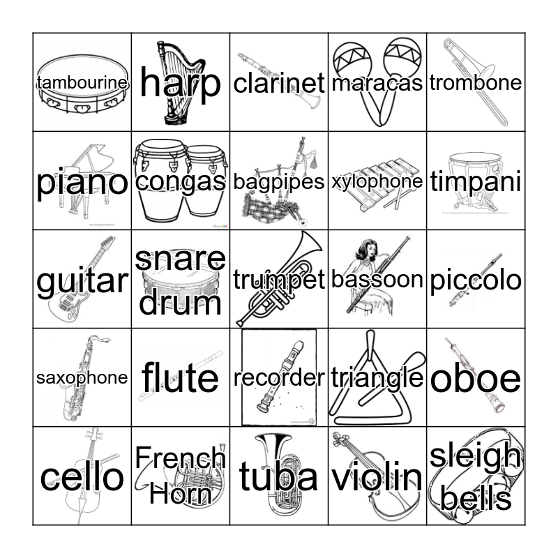 This bingo card has 24 images, a free space and 24 words: flute, French Horn, bagpipes, cello, trombone, tambourine, piano, harp, bassoon, recorder, xylophone, guitar, triangle, oboe, congas, violin, piccolo, clarinet, timpani, snare drum, sleigh bells, saxophone, maracas and tuba.