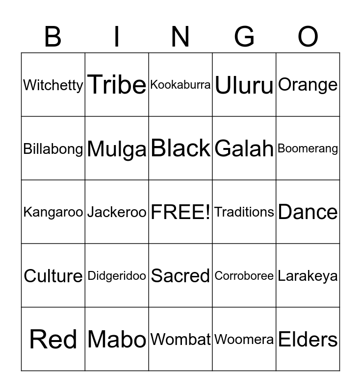 This bingo card has a free space and 24 words: Didgeridoo, Mabo, Black, Red, Orange, Witchetty, Billabong, Tribe, Traditions, Sacred, Galah, Kangaroo, Corroboree, Larakeya, Mulga, Woomera, Dance, Kookaburra, Boomerang, Jackeroo, Elders, Culture, Uluru and Wombat.