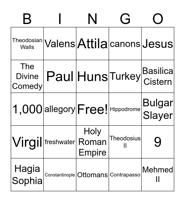 This bingo card has a free space and 34 words: Judas, Contrapasso, Justinian, Theodora, Virgil, Paul, Jesus, Hagia Sophia, Valens, Basil II, Huns, Attila, cisterns, Germanic, Hippodrome, Basilica Cistern, Constantinople, 1,000, freshwater, Theodosius II, Holy Roman Empire, dome, Theodosian Walls, Bulgar Slayer, Ottomans, Mehmed II, canons, Istanbul, Turkey, The Divine Comedy, 3, allegory, 9 and Treachery/Betrayal.