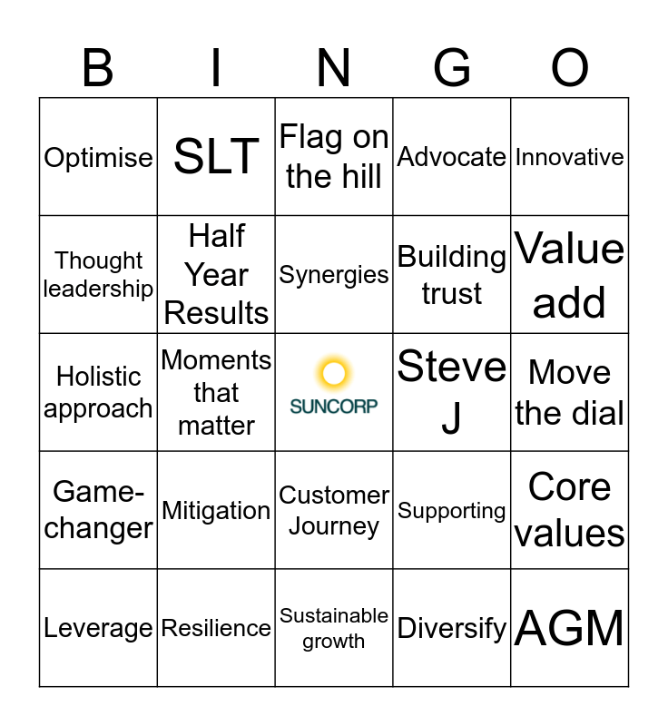 This bingo card has a free space and 24 words: Mitigation, Resilience, Synergies, Leverage, Innovative, Optimise, Thought leadership, SLT, Steve J, Customer Journey, Building trust, Holistic approach, Supporting, Core values, Half Year Results, Diversify, Move the dial, Flag on the hill, Value add, Moments that matter, AGM, Game-changer, Advocate and Sustainable growth.