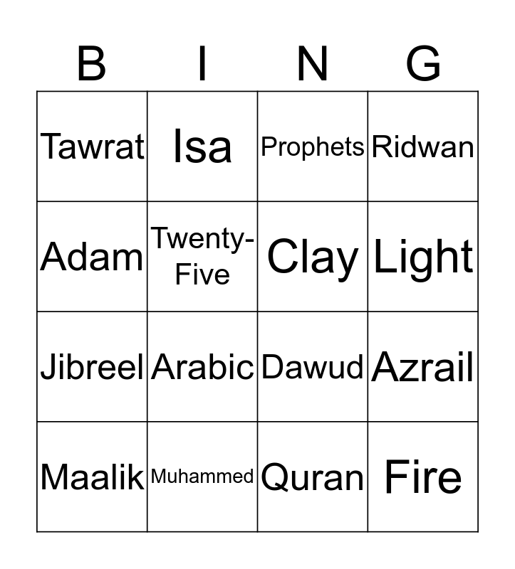 This bingo card has 16 words: Muhammed, Azrail, Prophets, Tawrat, Jibreel, Isa, Dawud, Quran, Adam, Twenty-Five, Maalik, Ridwan, Arabic, Light, Clay and Fire.