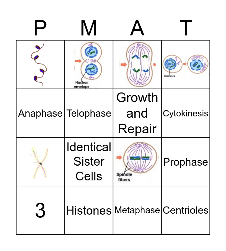 This bingo card has 6 images and 10 words: Histones, Prophase, Metaphase, Anaphase, Telophase, 3, Identical Sister Cells, Cytokinesis, Growth and Repair and Centrioles.