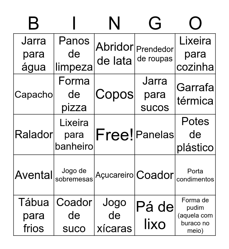 This bingo card has a free space and 51 words: Escorredor de macarrão, Forma de pudim (aquela com buraco no meio), Cortador de pizza, Jogo de xícaras, Jogo de sobremesas, Prendedor de embalagens, Panos de limpeza, Bandejas, Capacho, Cortador de queijo, Forma de pizza, Prendedor de roupas, Porta condimentos, Coador, Bule de café, Facas para cozinha, Copos, Panelas, Leiteira, Lixeira para cozinha, Lixeira para banheiro, Pá de lixo, Jarra para água, Jarra para sucos, Tábua de passar roupa, Frigideira, Garrafa térmica, Tábua para carnes, Tábua para frios, Abridor de lata, Baldes e bacias, Banquetas, Cesta para pão, Espremedor de alho, Coador de café, Coador de suco, Pegador de massa, Pipoqueira para micro-ondas, Potes multiuso, Assadeiras, Potes de plástico, Avental, Luvas, Cortador de massas, Escorredor de louças, Espremedor de frutas, Ralador, Rolo de abrir massas, Saleiro, Açucareiro and Vassoura.