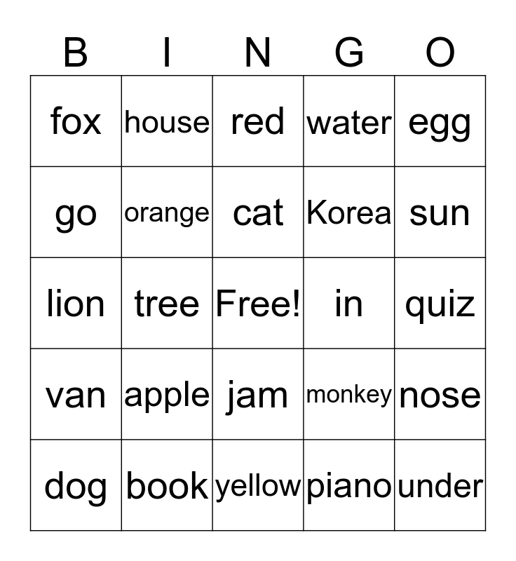 This bingo card has a free space and 24 words: apple, book, cat, dog, egg, fox, go, house, in, jam, Korea, lion, monkey, nose, orange, piano, quiz, red, sun, tree, under, van, water and yellow.